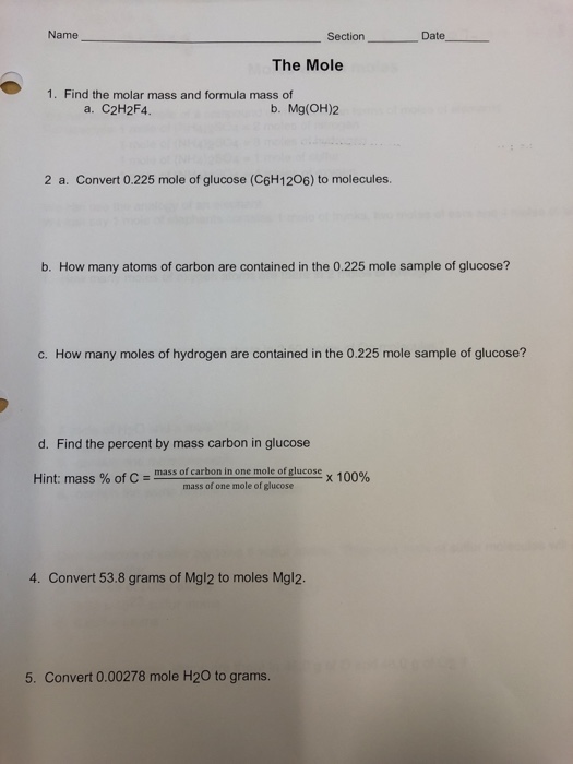 Name Section Date The Mole 1 Find The Molar Mass And Chegg Com